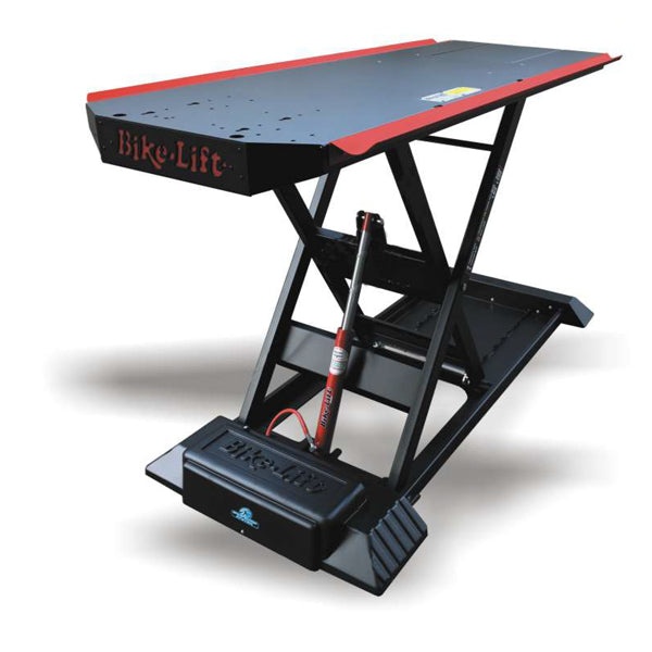 The Absolute 756 is the top of the range. It is the most versatile lift with a maximum loading capcity of 750 kg and a maximum lifting height of 130 cm , allowing it to be used for any kind of motorcycle. The gate version is equipped with a drop gate panel to enable the user to easily remove the rear wheel. Electro-hydraulic pump.
