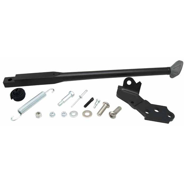 6061-T6 Aluminium side stand complete with all necessary fasteners, spring, fixing plate, and rubber tie.