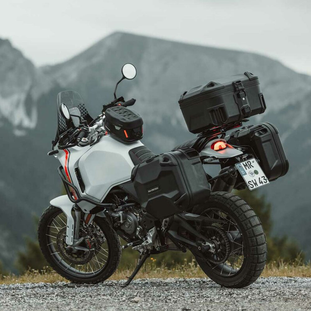 DUSC M Hard case Robust, waterproof and versatile; the DUSC hard case from SW-MOTECH was developed for any type of ride. Whether a sporty trip, off-road or on the big journey, the new DUSC cases will impress you with their versatility, easy handling and sturdy construction. The versatility of the DUSC system continues when you mount them on the motorcycle. Any DUSC case can be mounted as a top case or as a sidecase, left or right. Its own style and adventure DNA cut a fine figure on both touring bikes and adventure bikes. Robust construction The shell construction consists of thermoformed structured ABS plastic shells with a sturdy aluminum frame. The outer material is scratch-resistant and flexible; after impact effects, the plastic returns to its original position. When dropped on its side, the impact forces are absorbed by the plastic corners and transferred to the aluminum frame via the 3D shape of the lid. The well thought-out design and the interaction of the various materials make the DUSC extremely robust, with comparatively low weight. Can be used as a top case and side case In addition to its sturdy construction, the DUSC impresses with its universal versatility when mounted on the motorcycle. The case can be mounted both as a top case on rack and as a sideloader side case on the PRO side carrier - whether left or right. The DUSC is available in two sizes: The M version has a capacity of 33 liters, the larger L version holds 41 liters and offers space for a helmet. Simple attachment and secure hold Whether as a top case or as a side case: The DUSC is very easy to attach to the motorcycle. The case is placed on the retaining points and fixed to the carrier via the locking system. Thanks to the double security closes case opening and carrier connection with just one handle. In extensive tests, the DUSC has proven that it reliably holds its position on the carrier even in the event of strong vibrations and impacts. Thus, the DUSC is designed for a variety of uses and it is also suitable for extended off-road tours. Rugged and waterproof case Can be used as side case and top case M-version 33 liters / L-version 41 liters (fits one helmet) Easy mounting on PRO side carrier or rack Construction of thermoformed structured 3mm thick ABS plastic shells and an aluminum frame Co-locking closure system for lid and case carrier Protective corners on the lid side with integrated lashing options Integrated carrying handles Lock for closing case opening and beam connection (sold separately) Integrated hooks inside the case to organize the load (available as an option) Included in delivery 1 x DUSC M Hard case Mounting instructions Mounting material Details Material: ABS plastic Color: black Size: 48,6 x 41,3 x 24,7 cm / 19.1 x 16.3 x 9.7 in Volume: 33,0-33,0 l