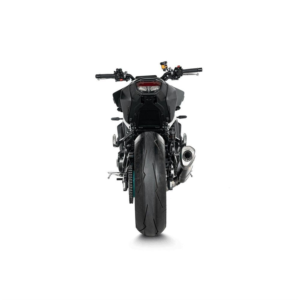 This exhaust has a lightweight carbon-fibre muffler outer sleeve, combined with stainless steel link pipes and headers and finished with a titanium end cap, to produce a system that is 2.6 kg (36,5%) lighter than stock. The new design features a shorter muffler for an enhanced sporty look, which exits on the side of the bike for visual impact. Power is increased by 3.3 kW (4.5 hp) at 9,600 rpm when compared in back-to-back tests on a MT-09 with a Racing Line (Carbon) exhaust and a standard stock exhaust system. The sporty racing sound is perfectly tuned to the engine. It is designed for use on tracks and closed-course competition circuits.
