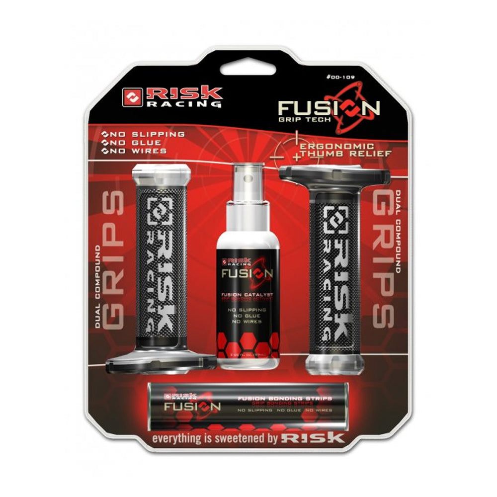 • Fusion Grip Tech comes packaged with the new Risk Racing Ergo Wave Grips. • High quality, dual compound soft grip with a reinforced grip end and an ergonomically designed grip flange. • Patent Pending Fusion Grip Tech Bonding Strips and Fusion Spray Catalyst Fitting System. Simply peel and stick the bonding strips to your bars. Then spray the bonding strips with the supplied Fusion Catalyst and easily slip your grip into place. At first the catalyst acts as a lubricant for easy grip installation, but after it dries it creates a lasting bond. The entire process is clean and simple. The ergonomic “wave” on the flange of the grip reduces pressure points between the riders thumb and the grip flange. Although this patent pending design feature is subtle, it greatly reduces heat and pressure, which reduces blistering and increases rider comfort.