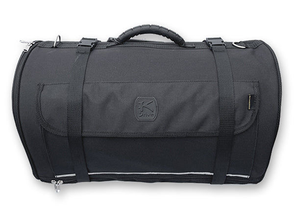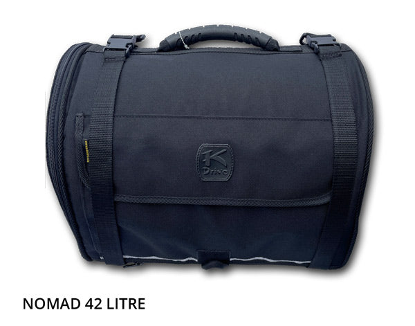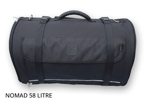 Nomad rollcases - a simple alternative to a hard topcase. Fabric roll bag with built-in frame to hold its shape. The bags are made from waterproof polyester fabric and have a side opening flap. Can be attached to the bike via heavy duty Velcro straps and adjustable elastic belts. Two sizes available, 42 litres or 58 litres.