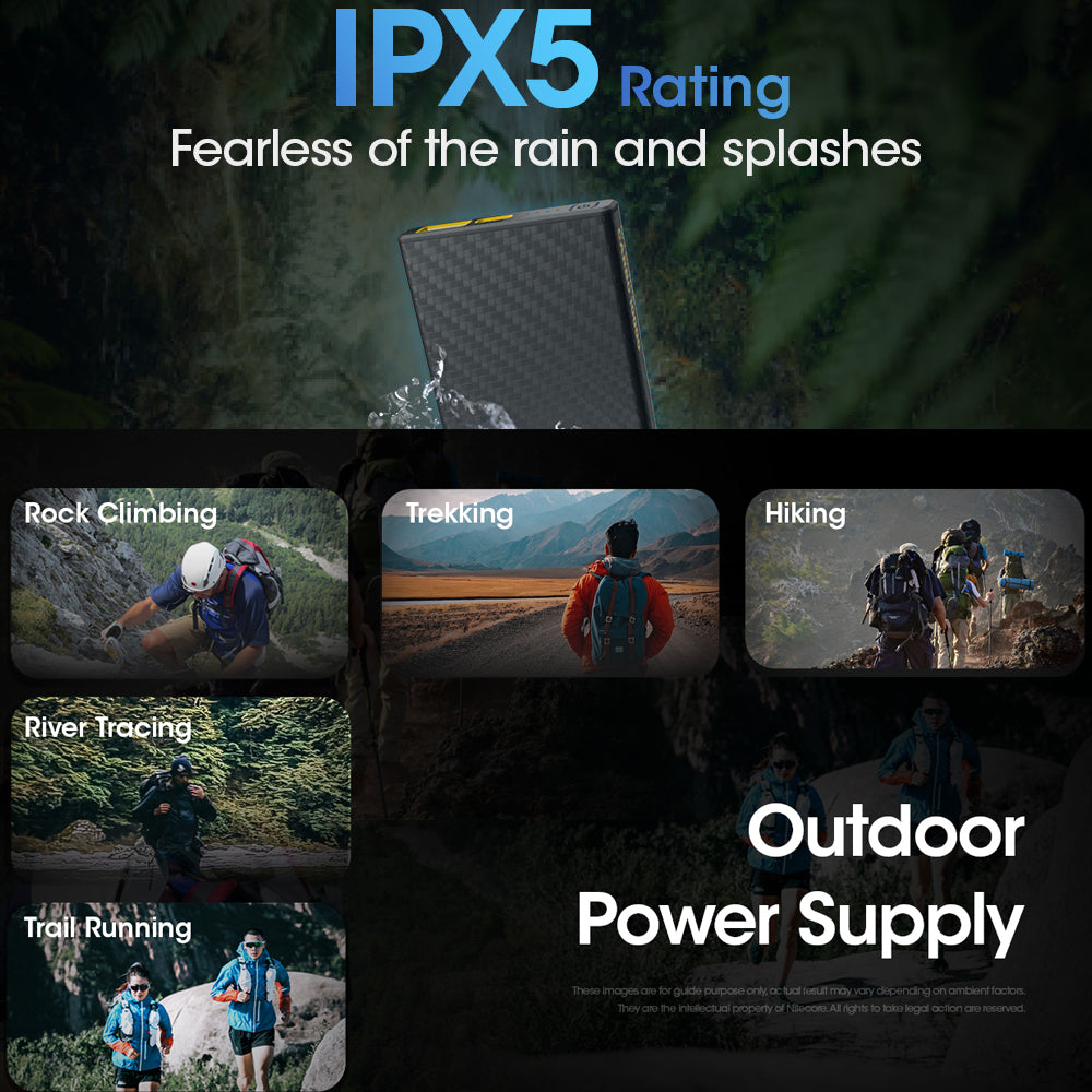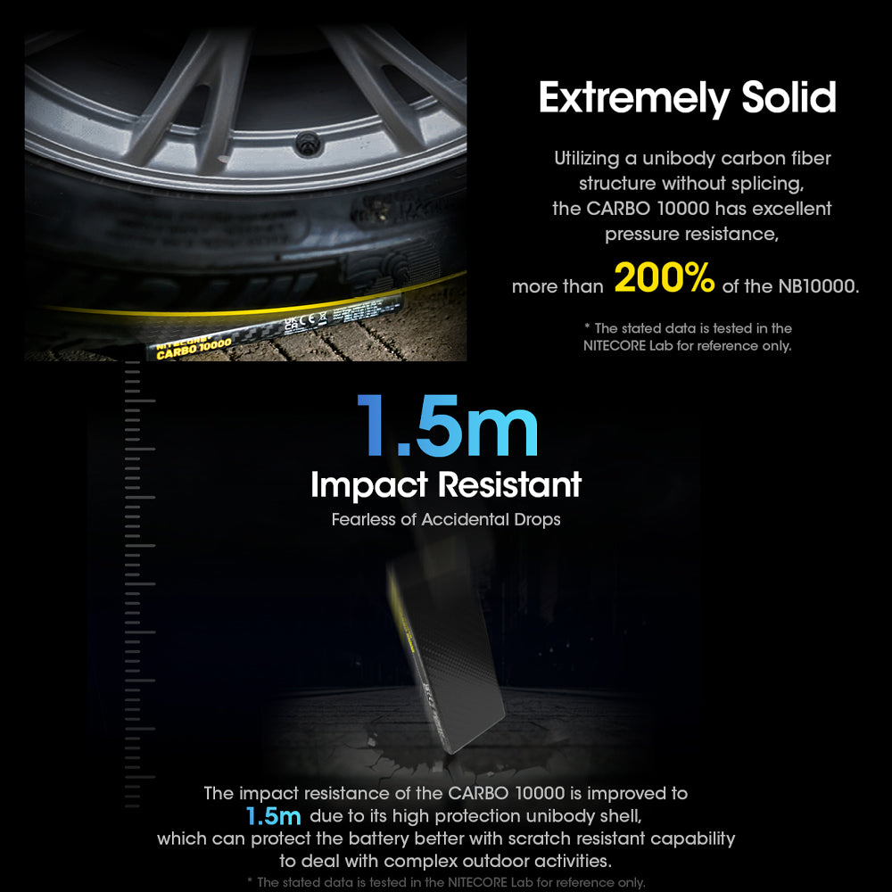 CARBO 10000, Ultra Lightweight Carbon Fiber Power Bank Unimaginable Light Weight Excellent Impact Resistance Unibody Carbon Fiber Shell The CARBO 10000 is made from a unibody carbon fibre shell without splicing to achieve lighter weight and optimal protection. Extremely Solid Utilizing a unibody carbon fibre structure without splicing the CARBO 10000 has excellent pressure resistance more than 200% of the NB10000. 1.5m Impact Resistance, Fearless of Accidental Drops The impact resistance of the CARBO 10000 is improved to 1.5m due to its high protection unibody shell, which can protect the battery better with scratch resistant capability to deal with complex outdoor activities. Ultimately Lightweight Extremely Slim Thanks to the lightweight carbon fibre shell, the CARBO 10000 has a thickness of 11.5mm and weighs 157g only, 45% lighter than conventional power banks with the same capacity. QC / PD Charging Compatible with various devices The CARBO 10000 can automatically detect different devices, available with 20W output and 18W input. Low Current Mode Long press the Mode Button to access low current mode. This mode is available for both USB-A and USB-C ports, suitable for charging low current devices including smart watches, smart bands, wireless headphones and more. Outstanding Energy Density Built-in 10,000mAh Large Capacity Li-ion Battery Energy Density of CARBO 10000: 243.9mWh/g What's in the box: • CARBO 1000 • USB-C Charging Cable Technical DataCell: Li-ion Capacity: 10,000mAh 3.85V (38.5Wh) Rated Energy: 6,400mAh 5V (TYP 1A) Input: USB-C: 5V 2.4A / 9V?2A Output: USB-C: 5V 3A / 9V?2.22A / 12V?1.68A USB-A: 5V 3A / 9V 2A / 12V?1.5A Dual Ports: 5V 3A (MAX) Dimensions: 124mm x 59mm x 11.5mm (4.88" x 2.32" x 0.45") Weight: 157g±5g (5.54 oz±0.1 oz) Accessory: USB-C Charging Cable