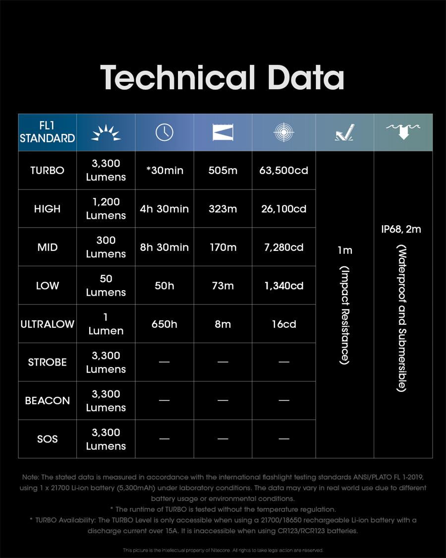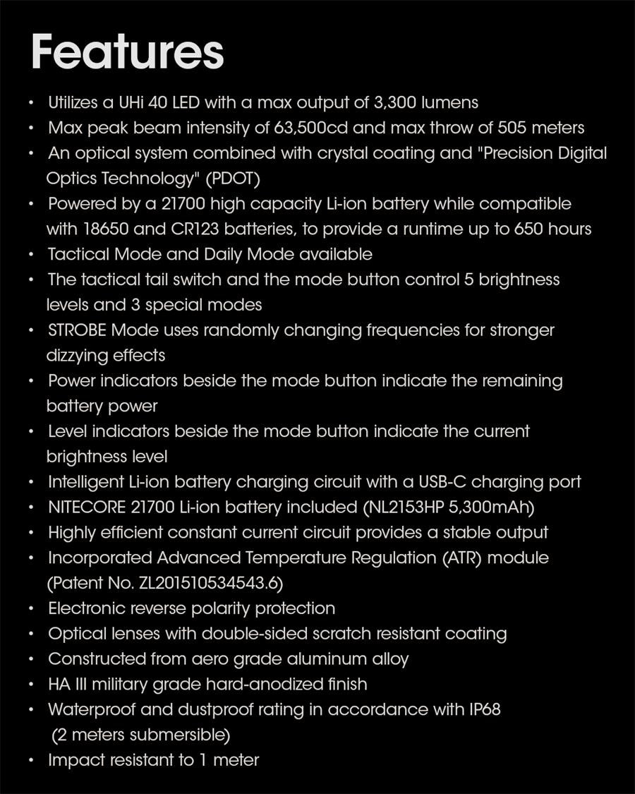 3300 Lumen High Lumen Flashlight The Nitecore MH12 Pro rechargeable flashlight is incredibly bright yet still compact enough to serve as a duty light to carry every day. With its innovative UHi 40 LED from NiteLab, the MH12 Pro boasts a 3300 lumen output and a 552 yard throw, farther than 4 football fields length added together. You'll be well-prepared for any situation with its five brightness levels, as well as strobe, beacon, and SOS modes. The MH12 Pro features a Tactical Mode with five lighting settings and strobe, while the Daily Mode offers the same settings plus a Beacon and SOS mode. Level indicators beside the mode button will help you identify the current brightness level. Moreover, the MH12 Pro includes a built-in optical sensor that automatically reduces brightness when it detects an obstruction at close range to prevent blinding reflection or overheating. USB-C Rechargeable The MH12 Pro comes with a high-capacity 5300mAh battery and can be rapidly charged through its built-in USB-C port. Power indicators next to the mode button display the remaining battery level. Once fully charged, the MH12 Pro can achieve a maximum runtime of over 650 hours on its lowest mode. Sturdy and Dependable Crafted from aero-grade aluminum alloy with an HA III hard-anodized finish, boasting an IP68 waterproof rating, and featuring advanced temperature regulation, the MH12 Pro is an indispensable companion day in and day out. Whether you're using it for daily tasks, patrolling, or camping and hiking, the MH12 Pro is equipped for any environment. What's in the box: • Nitecore MH12 Pro • Nitecore NL2153HP Rechargeable Li-ion Battery • USB-C Charging Cable • Clip • Lanyard • Spare O-ring • Holster Max Output 3,300 Lumens Max Beam Distance 505m Max Beam Intensity 63500 cd Max Runtime 650 h 0 m / 27.08 d LED NiteLab UHi 40 LED Reflector SMO Battery 1 × 21700, 2 x CR123/RCR123 Special Modes Strobe Beam color White Light Length 138.5 mm / 5.45 in Head Size 26.8 mm / 1.06 in Weight 82 g / 2.89 oz Feature Rechargeable, Tail Stand Activity Search, Outdoor/Camping, Emergency