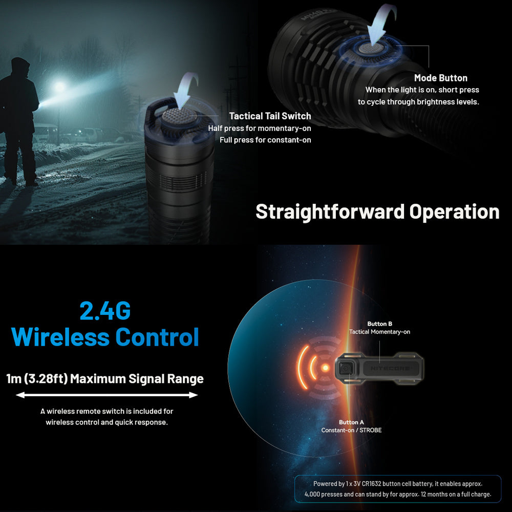 NITECORE Ultra Bright Long Range Hunting Flashlight Astonishing Output Through the Darkness Provides a max beam intensity of 423,000cd, ideal for search, patrolling, caving, SAR (search and rescue). Law enforcement and more. 62h Extended Runtime A NITECORE NBP100R rechargeable Li-ion battery pack is included that fits snugly without rattling inside the flashlight. Equipped with a USB-C charging port, it can also double as an emergency power supply. Straightforward Operation Tactical Tail Switch: Half press for momentary-on, Full press for constant-on. Mode Button: When the light is on, short press to cycle through brightness levels. 2.4G Wireless Control 1m (3.28ft) Maximum Signal Range: A wireless remote switch is included for wireless control and quick response. Highly Efficient Constant Circuit (Non-PWM) The constant brightness beam without flashing guarantees a comfortable visual experience. What’s in the box: • MH40 Pro • Wireless Remote Switch • Hook and Loop Fastener • Hool and Loop Strap x 2 • Picatinny Rail Mount x (Optional) • Nitecore NBP100R Li-ion Battery Pack (10,000mAh) • USB-C Charging Cable • Spare O-ring • Holster • Lanyard Specifications: Max Output 3,500 Lumens Max Beam Distance 1,300 Meters Max Beam Intensity 423,000 cd Max Runtime 62 h 0 m / 2.58 d LED NiteLab UHi 40 MAX LED Reflector SMO Battery 2 × 21700, NBP100R Special Modes Location Beacon, SOS, STROBE Beam color White Light Length 256 mm / 10.08 in Head Size 65 mm / 2.56 in Weight 270 g / 9.52 oz Feature STROBE READY, Rechargeable Activity Hunting, Law Enforcement, Search, SAR(search and rescue), Patrolling, Emergency Lighting, Emergency, Tactical, Caving