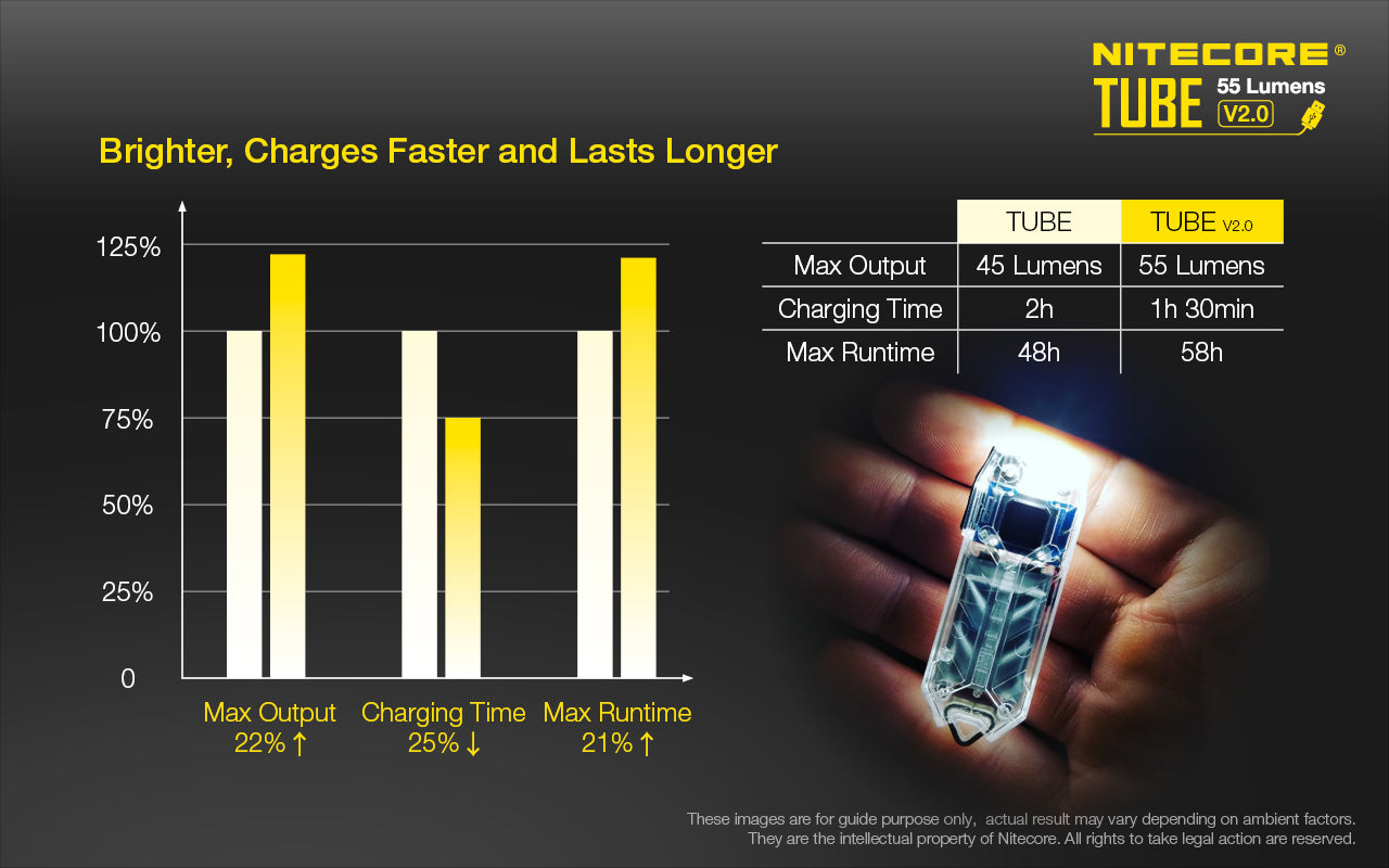 Description The Nitecore TUBE v2 LED Key Chain Flashlight (Black) is dust- and water-resistant, 1-55-lumen key chain LED flashlight. It has a single multi-stage switch that allows you to choose either a low or high output, as well as an infinitely variable output in-between when using the brightness feature. A built-in Li-ion battery charges via a micro-USB port and can provide up to 58 hours of runtime on low output or 1.3 hours on high. The light is impact resistant up to 3.3' and IP65 water-resistant. At 2.2 x 0.8 x 0.3" and just 0.3 ounces, it's about the size of a car key fob except much lighter—you'll never want to be without it on your key ring. What's in the box: • TUBE V2.0 • Key Ring Key Features: Low: 1 lumen. High: 55 lumens. 100° beam angle. One-year standby power. Over-discharge protection. Overcharge protection. Short-circuit protection. Integrated blue power indicator. Specifications Illumination Source 1 x LED White Light Output Low: 1 Lumens High: 55 Lumens Battery Type 1 x Built-In Lithium-Ion Estimated Runtime Low: 58 Hours High: 1.3 Hours Internal Battery Capacity 125 mAh Charging Time 1.5 Hours Material of Construction Polycarbonate IP Rating IP65 Impact Resistance Yes, 3.3' / 1 m Dimensions H: 0.3 x W: 0.8 x L: 2.2" / H: 0.8 x W: 2.0 x L: 5.6 cm Weight 0.34 oz / 9.6 g (With Battery)