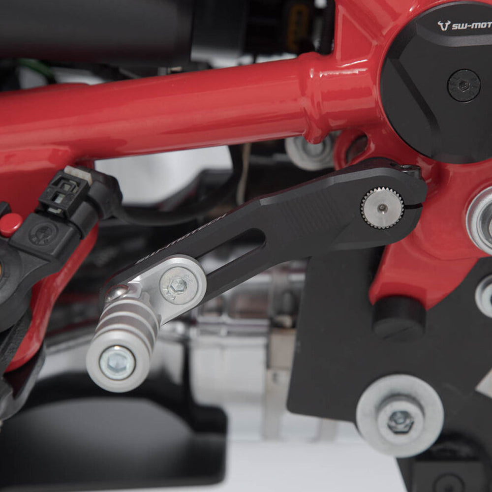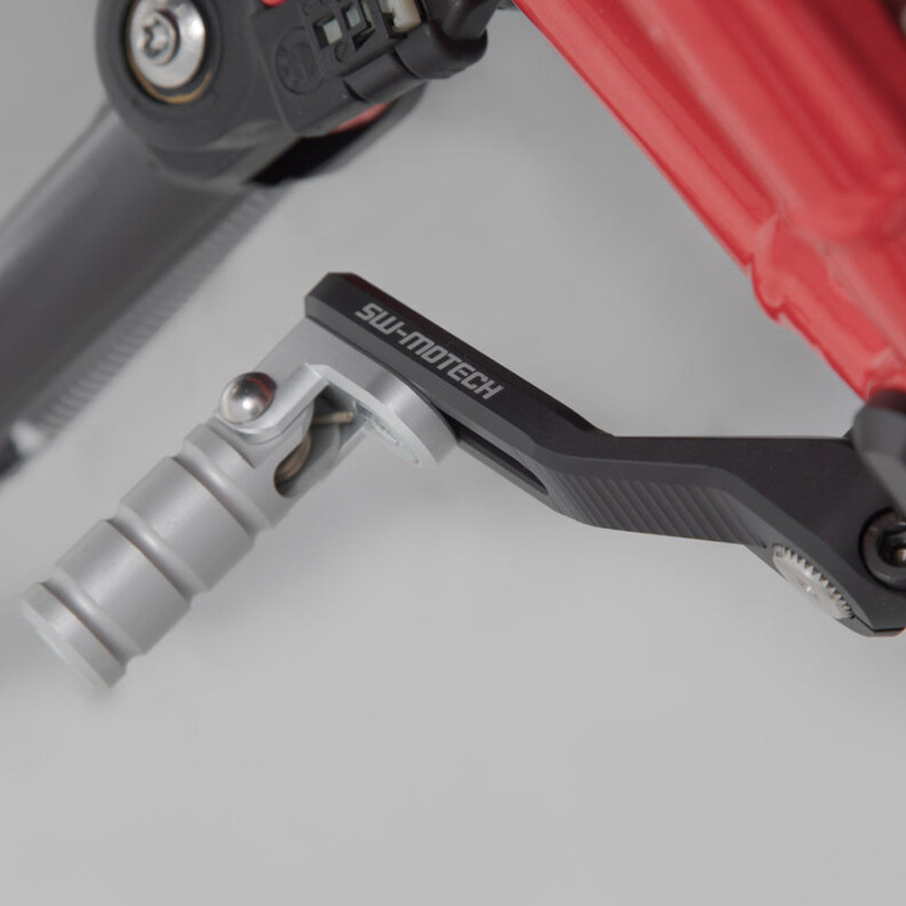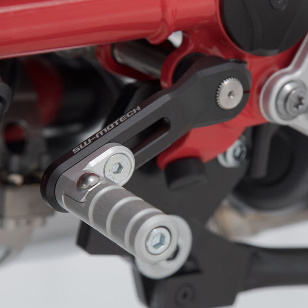 Gear lever The gear lever for the BMW R nineT, made of high-quality, machined aluminum alloy, allows for continuously variable adjustment, for finding the optimal gear shift position. Gear levers by SW-MOTECH combine specially selected materials and innovative design with perfect fit. A HART-COAT® treatment prevents scratches on the lever, the built-in valve spring protects the gear lever in case of a crash. Two-part gear lever with continuously adjustable unit Distance between toe peg and bore on original gear lever: 60 mm Adjustment range of distance between toe peg and bore on SW-MOTECH gear lever: 32 - 86 mm The tread can also be mounted rotated 180 degrees Better ergonomics and safe operation of the gear lever A spring mechanism enables it to be folded down and protects it from breaking in case of a crash Robust and elegant: CNC-milled, HART-COAT® coated aluminum Mounting of an extension for gear lever for expanding the tread surface possible General Operating License not required for German traffic Included in delivery 1 x Gear lever Mounting instructions Mounting material Details Material: Aluminum / Aluminum Surface: anodized / anodized Color: black / silver Total Weight: appr. 0,1 kg / appr. 0.3 lb