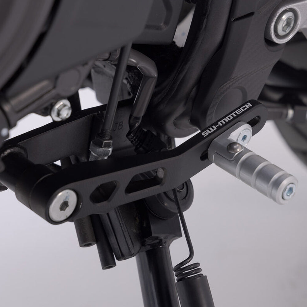 The gear lever for the Honda CB500X (22-) is milled from high-quality aluminum alloy and can be continuously adjusted to find the optimal gear position. Gear levers by SW-MOTECH combine specially selected materials and innovative design with perfect fit. A HART-COAT® treatment prevents scratches on the lever, the built-in valve spring protects the gear lever in case of a crash. Two-part gear lever with continuously adjustable unit Distance between tread and switching shaft on original gear lever: 120 mm Adjustable range of distance between tread and switching shaft on SW-MOTECH gear lever: 93-147 mm The tread can also be mounted at a 180° angle. Better ergonomics and safe operation of the gear lever A spring mechanism enables it to be folded down and protects it from breaking in case of a crash Robust and elegant: CNC-milled, HART-COAT® coated aluminum Mounting of an extension for gear lever for expanding the tread surface possible