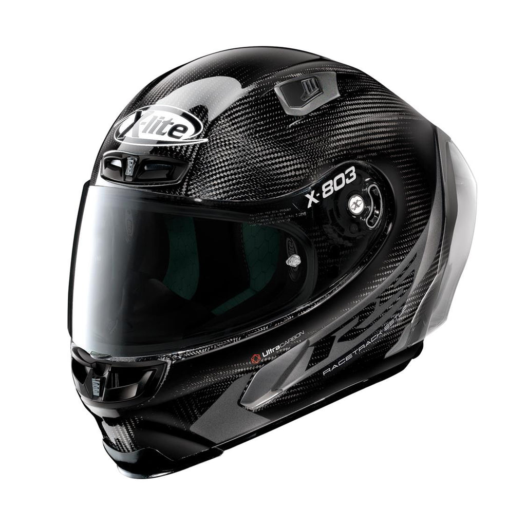 The X803RS Ultra Carbon is packed with features and enhanced by an exclusive racetrack setup. It comes with an additional clear visor, a Racetrack Aerodynamic Spoiler (removable), and an exclusive adjustment system for the position of the liner. Also includes all the same high quality features of the original X803 Ultra Carbon, such as the Nolan Emergency Release System to allow emergency teams to remove the helmet with minimal risk of further injury, Racing Air Flow ventilation system to keep you cool, and an Adjustable Stability Device so you can optimize air-flow for your own body size and riding style, as well as the usual premium features like a double action, Pinlock® visor, Single Block cheek pads, washable carbon inner liner and a revised chin shape to improve comfort.